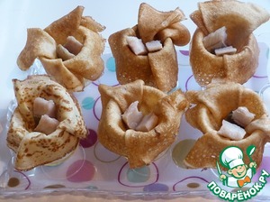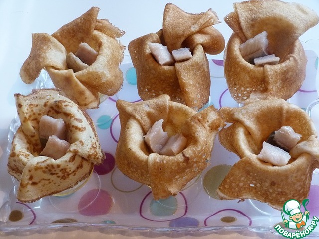 Разложить сельдь (по 2 кусочка) по блинным "корзиночкам".