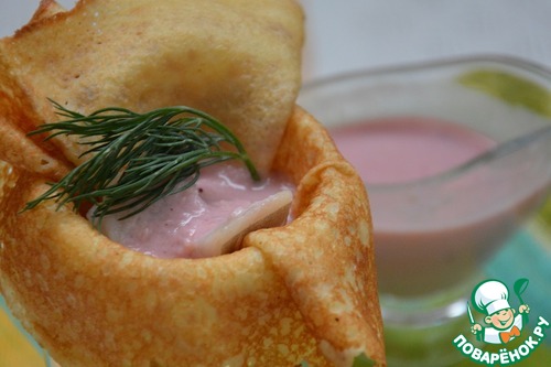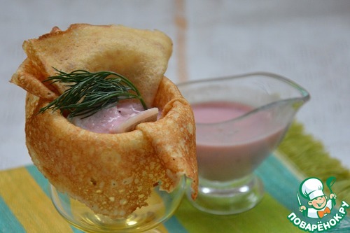 Мне понравилось подавать сельдь под соусом в блинчиках. Если и Вам такая подача будет ближе, то предварительно надо испечь по любому любимому рецепту тонкие простые блинчики. Каждый испеченный блинчик сложить вчетверо, вставить его в небольшой стаканчик или рюмку и расправить, чтобы получилась как бы форма корзиночки. Затем пусть блинчики остынут. -