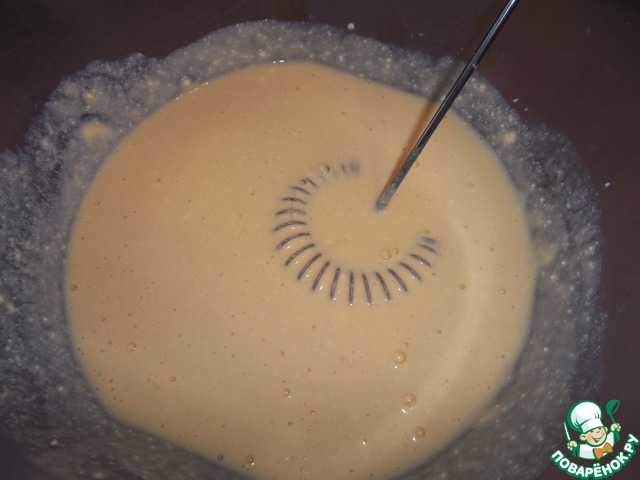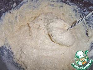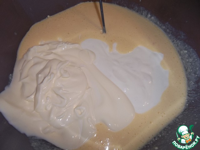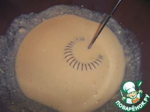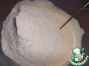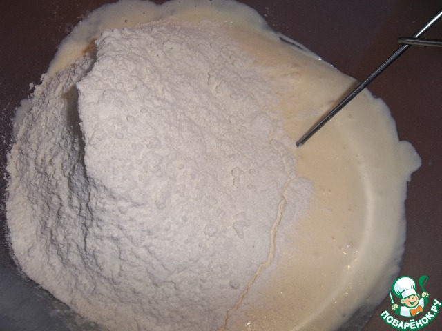 Далее добавляем разрыхлитель и муку, все перемешиваем.