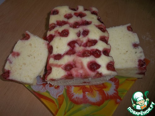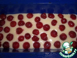 Сверху, слегка вдавливая, выкладываем вишню. Ставим форму в микроволновку и выпекаем 15 минут при мощности 750Вт.