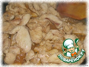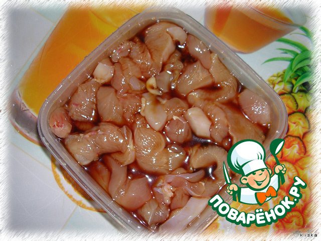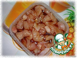 • Куриную грудку порезать (лучше мельче чем у меня) и замариновать в соевом соусе на 10-15 минут.