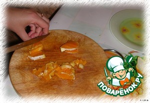 • Апельсин порезать кубиками и также чуть–чуть обжарить на масле.