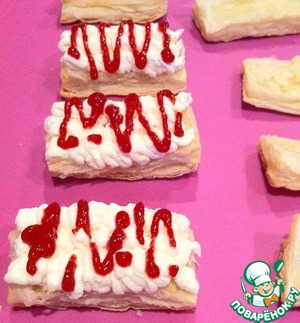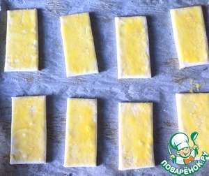 Пласт теста разрезать на 8 одинаковых прямоугольников. Смазать желтком, присыпать сахаром и выпекать 10 минут при 230 градусах.