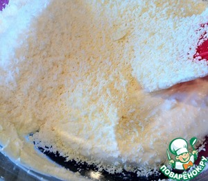 Для крема взбить маскарпоне со сливками в пышную массу. Аккуратно вмешать тёртый белый шоколад и кокосовую стружку. Крем отправить в холодильник на 20 минут.