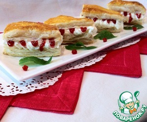 Остывшие ломтики разрезать вдоль на две части. Нанести крем из маскарпоне и брусничный соус.