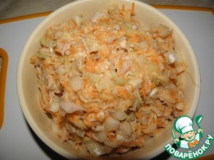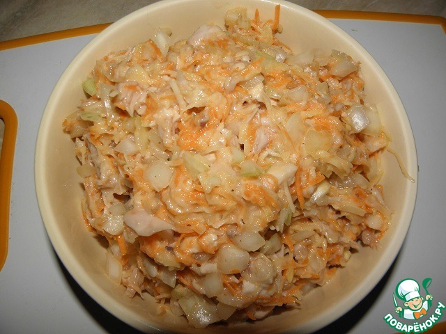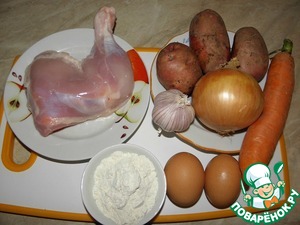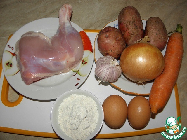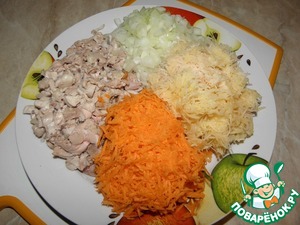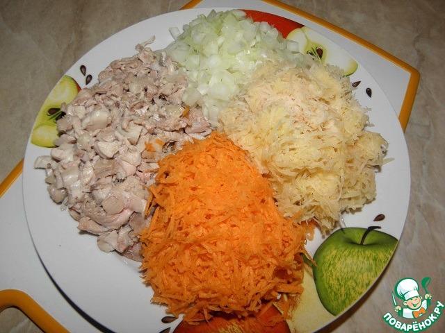 Окорочок отварить, мелко нарезать, морковь и картошку натереть (можно на мелкой или на средней терке)., лук мелко нарезать.