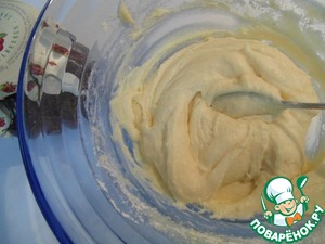 Добавить в чашу муку с разрыхлителем и сливочное масло, коньяк и все хорошо перемешать.