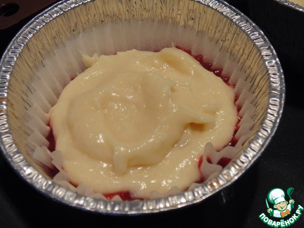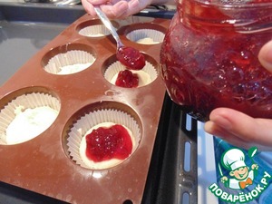 Формочки для кексиков заполнить наполовину тестом, сверху 1,5 ч. л. брусничного соуса.