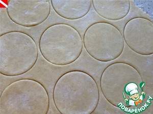 На присыпанной мукой поверхности раскатываем тесто толщиной 0,5 см и формочкой вырезаем круги диаметром 4-5 см.