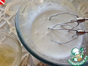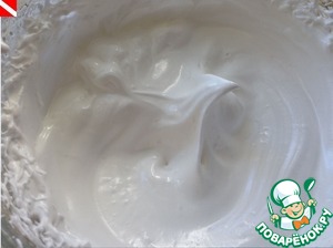 Когда белки превратятся в пышную белую массу, добавляем желатин и продолжаем взбивать до устойчивых пиков. Перекладываем массу в кондитерский мешок и отправляем буквально на 5 минут в холодильник.