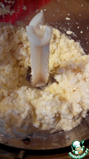 Замесим тесто. Хорошенько перетрем творог, сливочное масло комнатной температуры и яйцо. Я делала это блендером