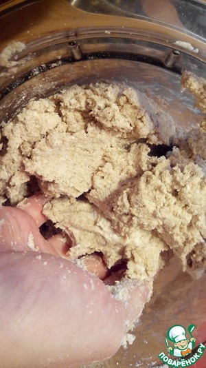 Добавим в творожную массу соль, разрыхлитель и оба вида муки. Вымешаем тесто. Сформируем из теста шар, обернем в пленку и уберем в холодильник на то время, пока будем готовить начинку.