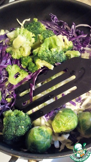 Добавляем к луку нашинкованную белокочанную и краснокочанную капусту. Обжариваем пару минут на среднем огне. Брюссельскую капусту и брокколи отварите их в кипятке в течение пары минут, откиньте на дуршлаг и добавьте к остальным овощам. Посолите, добавьте любимые приправы (я добавила смесь для тушения овощей и сушеный базилик) и потушите еще минуты 3-4. -