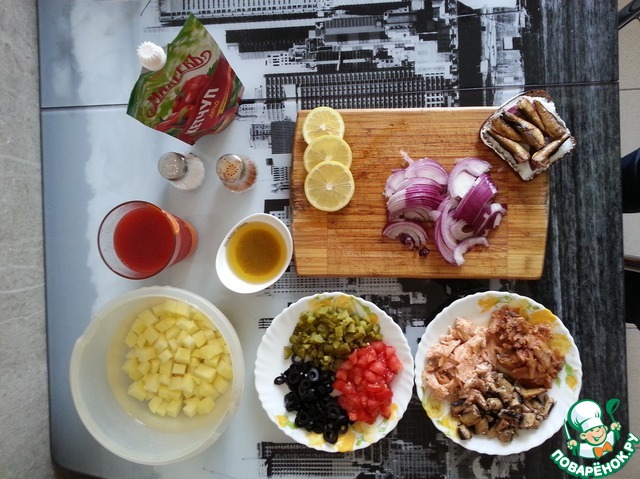 Ингредиенты для «Сборная солянка из рыбных консерв»: