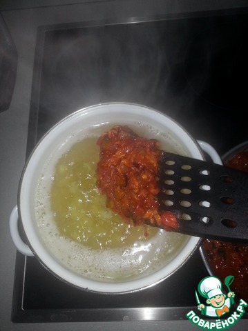 Через 5 минут в сковороду добавляем томатный сок и томатную пасту. Солим и перчим по вкусу.