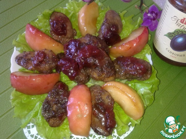 • На листья салата выложить обжаренную куриную печень и карамелизованные яблоки. Полить салат из куриной печени сливовым соусом d'arbo. Угощайтесь!!!