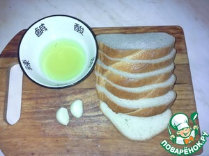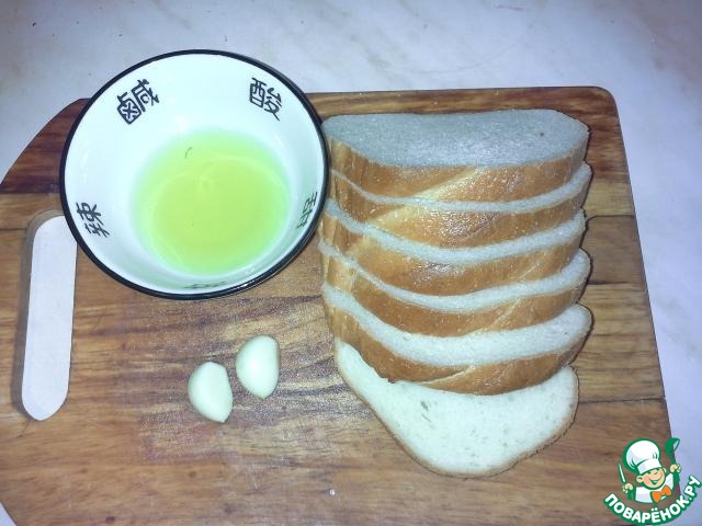 • Бульон еще не закипел, поэтому можно заняться крутонами. Для начала режем чеснок.