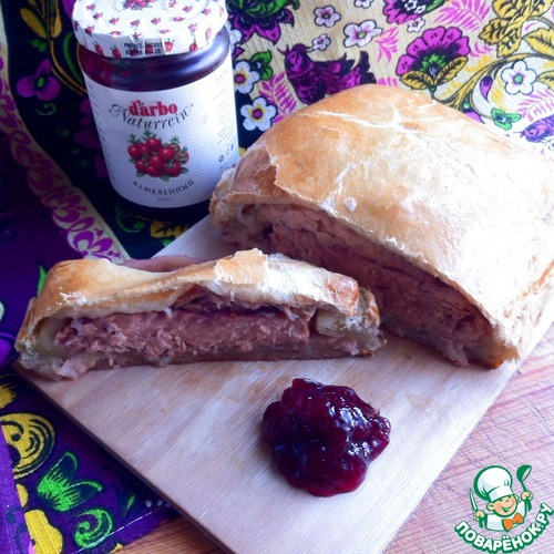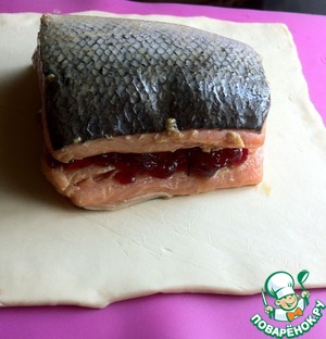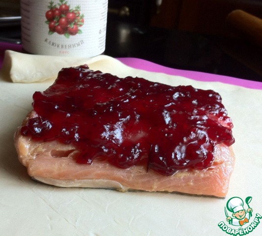 Раскатать, слоеное тесто. Филе слегка промокнуть бумажным полотенцем и выложить на тесто кожей вниз. Смазать клюквенным соусом D'arbo.