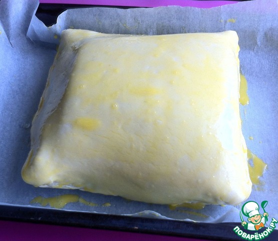 Тесто хорошенько защипываем конвертом. Выкладываем пирог на противень швом вниз. Смазываем желтком. Запекаем при 220 градусах 25-35 минут.