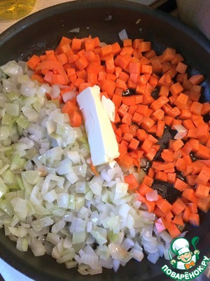 Добавляем морковку к луку, и к ним кладем кусочек сливочного масла.