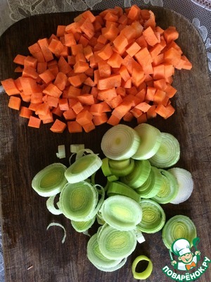 Морковь нарезаем кубиками, лук-порей кольцами.