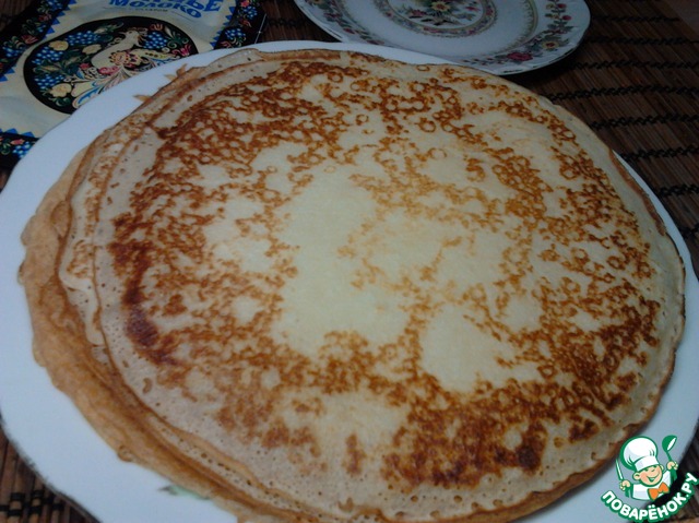 Блинчики... наверно, нет такого человека, который бы их не любил... Рецептов их множество, и у каждой хозяйки он свой, со своими секретами. У меня, если честно, нет такого рецепта, которым бы я пользовалась постоянно-мне хочется печь всегда "новые" блинчики... и рецепты беру именно с "Поварёнка" (а их здесь немало, хватит на каждый день...). Но пару рецептиков у меня в запасе есть: это, конечно же, мамины блинчики (с манной крупой, если вам будет интересно, то в скором времени могу показать и рассказать...) и блины, рецепт которых нашла в стареньком журнале... Ну, а каковы у меня получились блинчики, судить вам!!! Прошу...