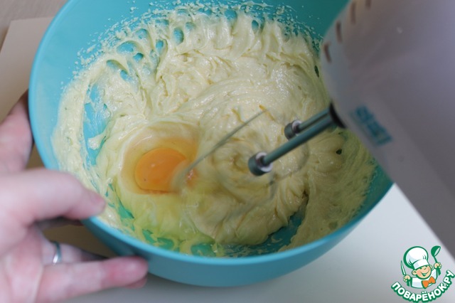 Берем теперь мягкое масло и взбиваем его с сахаром. Постепенно добавляем по одному яйца. При этом не преставая взбивать.