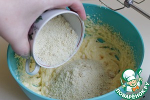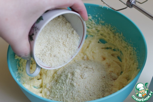 Добавляем цедру в масло, миндальную крошку и муку. Все перемешиваем.