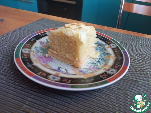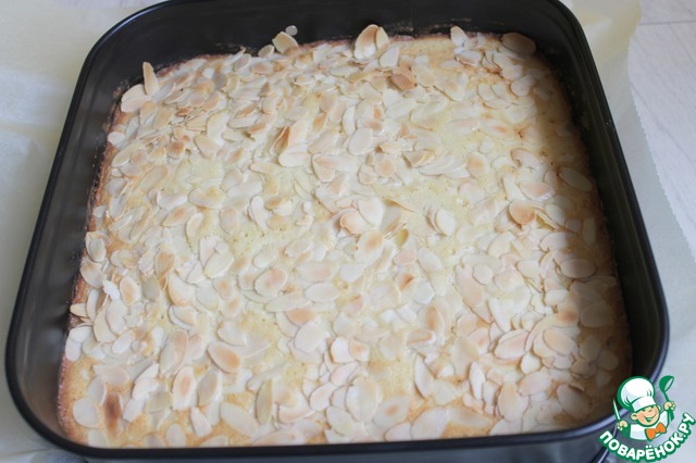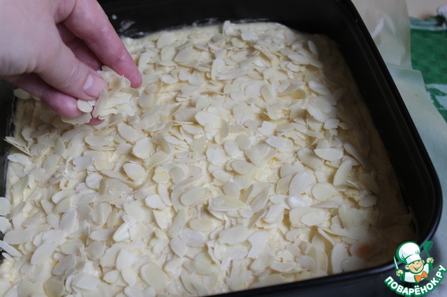 Посыпаем сверху миндальными лепестками. Накрываем форму фольгой. И ставим дальше запекаться на 20минут. При 200гр. После 20 минут открываем и держим еще 10 минут до подрумянивания.