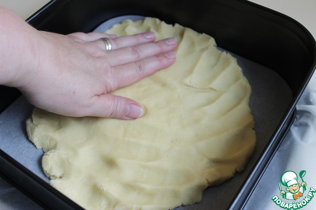 Берем форму 24на 24см. Застилаем ее бумагой для выпечки. И выкладываем сразу тесто. Руками распределяем его по дну формы. И ставим в разогретую духовку до 210гр на 5 минут.