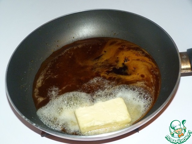 Лучше всего это делать так: куском масла проводить по краю сковороды, масло будет таять и смешаться с карамелью.