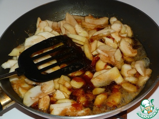 • Выложить в сковороду яблоки, перемешать. Огонь убавить до минимального и, помешивая, готовить на маленьком огне до размягчения яблок.