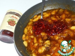 • Выложить в сковороду брусничный соус "D'arbo", перемешать, и продолжать готовить минут 3 (за это время яблочно-брусничный соус должен слегка загустеть).