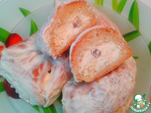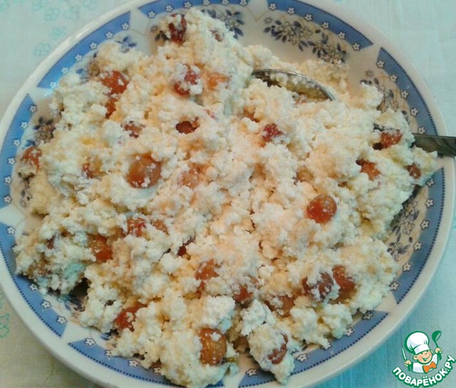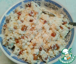 Изюм, замоченный в воде, просушенный и перебранный смешиваем с творогом и желтками. Начинка готова.