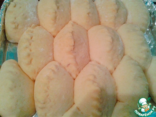 Пирожки овальной формы готовы. Не смотря на то, что мы не смазыаали пирожки яичной глазурью, сдобное тесто покрылось красивой аппетитной корочкой.