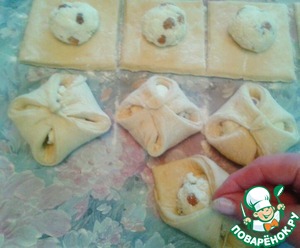 На каждый квадрат кладем 1 ст. л. начинки и соединяем углы. Выпекаем так же, как и овальные.