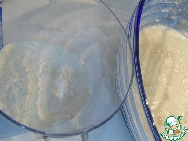 Тесто: взбить миксером яйца с сахаром. В отдельной посуде смешать 100 г муки, крахмал и разрыхлитель теста. Добавить к яичной смеси, взбить.