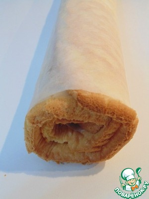 Противень (35*40) застелить бумагой для выпечки. Вылить тесто на противень, разровнять. Выпекать в заранее разогретой духовке при 200 град. С 15 минут, не передержать. Готовый бисквит вместе с бумагой свернуть в рулет. Дать отдохнуть 15 минут, снять с бумаги. И снова вместе с бумагой свернуть в рулет.