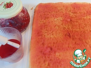 Приготовить сироп для пропитки: я использовала уже готовый сироп Алькермес, если его нет, то в кастрюлю насыпать 100 г сахара, добавить 100 мл воды, поставить на огонь, подогреть до растворения сахара, добавить коньяк, остудить до комнатной температуры. Бисквит развернуть, пропитать сиропом.