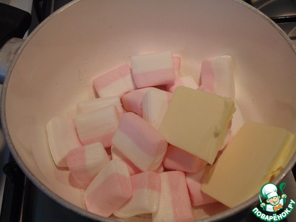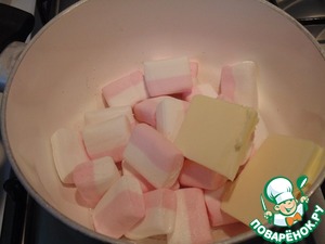 Крем: в кастрюлю положить маршмеллоу, сливочное масло и 3 ст. л. горячей воды. Поставить на маленький огонь, растопить, постоянно помешивая.