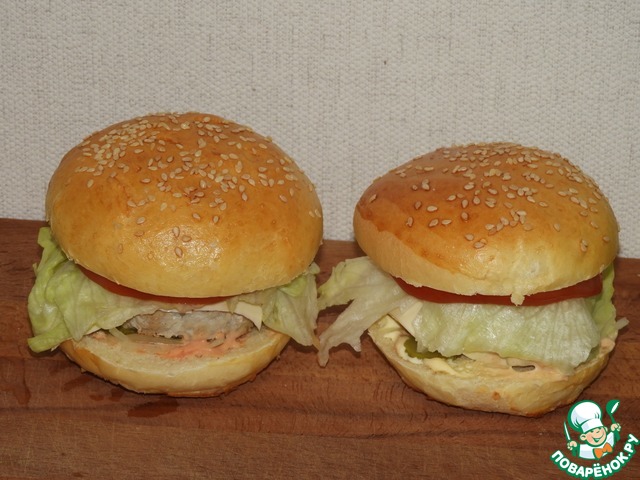 Булочки разрезаем вдоль пополам и на месте среза обжариваем булочки на сливочном или растительном масле до образования хрустящей корочки. Это важный нюанс, который улучшит вкусовые качества готового бургера.