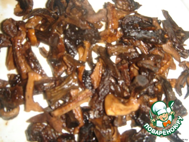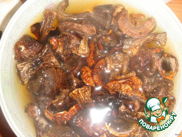 Грибы перебрать, промыть, залить горячей водой и оставить на 3—4 часа, затем отварить в подсоленной воде, вынуть шумовкой и нарезать соломкой.