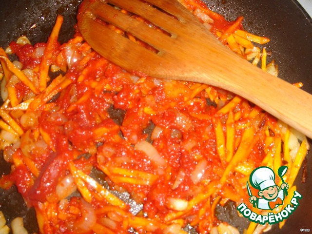 Лук, морковь и корень петрушки (у меня корня петрушки в этот раз не было) нарезать соломкой и спассеровать на жире, либо на растительном масле. Добавить очищенные от кожицы и нарезанные помидоры или томатную пасту.