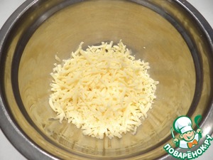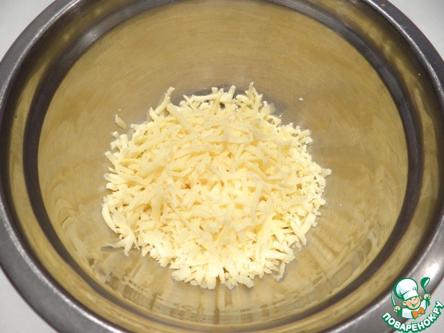Пока поднимается тесто, готовлю начинку. Твердый сыр натираю на крупной терке.