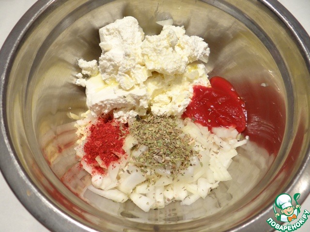 В миске соединяю твердый сыр, творог, репчатый лук, томатную пасту, паприку, орегано и оливковое масло.