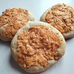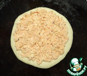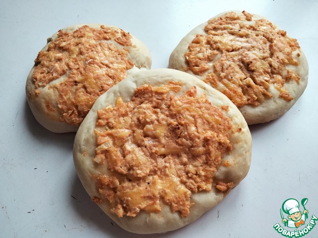 Противень смазываю маслом, выкладываю на него раскатанные лепешки, распределяю поверх них начинку, чуть отступая от края лепешек.