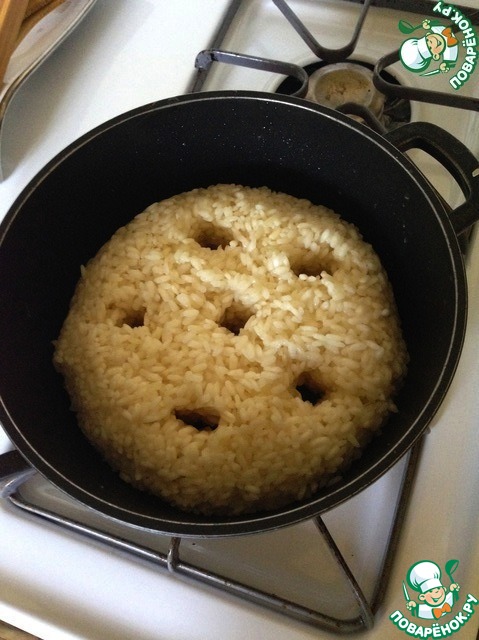 Когда вода полностью выкипет, соберите рис горкой и сделайте в нем углубления обратной стороной деревянной ложки до дна, чтобы рис равномерно приготовился. Вы увидите что в углублениях кипящие пузырьки прозрачные, значит вода уже вся выкипела, осталось масло. Но если вода еще не вся выкипела дождитесь именно того момента, когда не будет ее признаков )))! Максимально снижаете огонь, закрываете плотной крышкой на 15 мин.