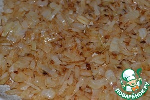 В сковороде на большом огне разогреть небольшое количество растительного масла и обжарить лук до золотистого цвета. Огонь не убавляем, лук жарим постоянно помешивая.