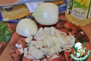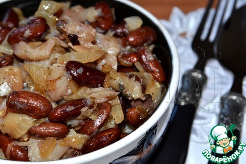 Фасоль промыть и поставить отвариваться до готовности (воду не солить!), т. к. рыба соленая. Лук мелко порезать.