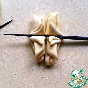 Разместите палочку в центре кусочков, перпендикулярно срезам, прижмите слои теста палочкой.